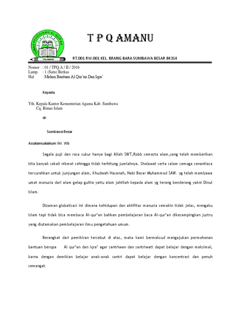 Surat Permohonan Bantuan Al-Qur\'An - Bantuan Buku Cerita Islami dan Al Qur'an untuk Desa ... - Dengan menyebut nama allah yang maha pemurah lagi maha penyayang.